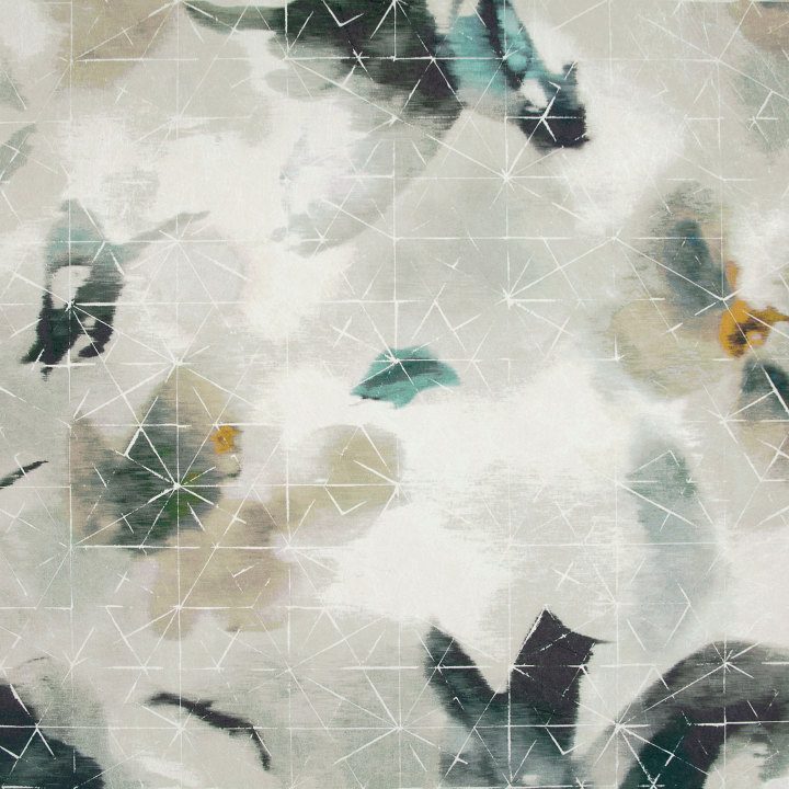 Abstraktes florales Design mit orientalischen Elementen und künstlerischem Ausdruck, zart durchbrochen durch ein raffiniertes geometrisches Design mit lebhaften Farbeinschüssen. Orimono hat die Optik von luxuriösem, handgeschöpftem Papier mit schimmernder Textur und feinen, seidenartigen Fasern.