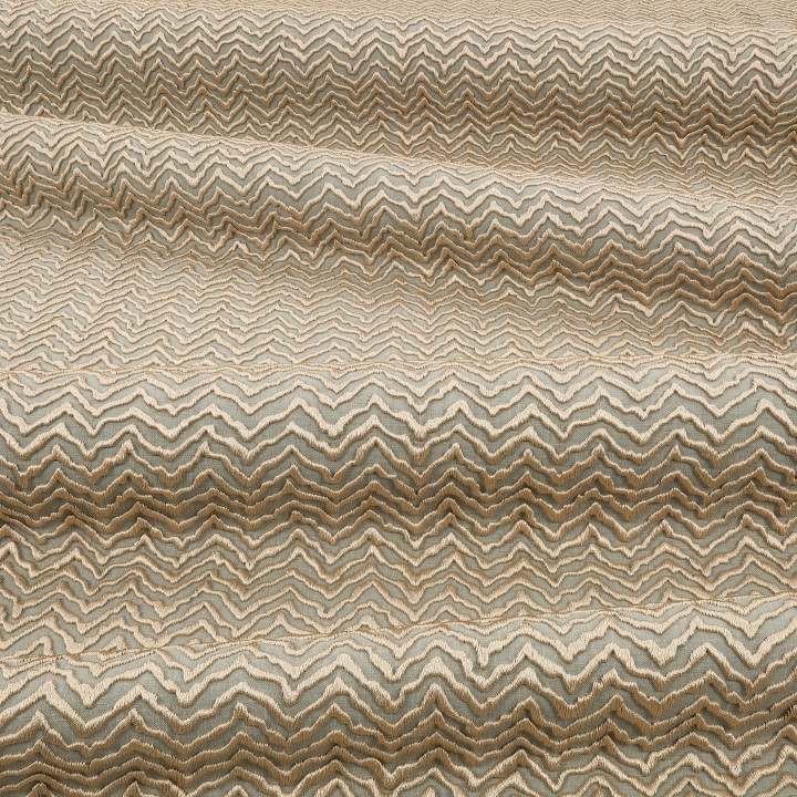 Orgánicas ondas angulares tridimensionales esculpen una tela para cortinas opulenta y voluminosa. Gracias a una técnica innovadora, los hilos de bordado en relieve tienen la apariencia de estar flotando, e introducen ondulaciones rítmicas que crean un fascinante efecto dinámico.
