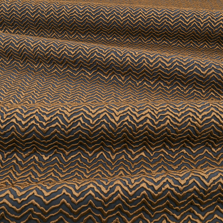 Orgánicas ondas angulares tridimensionales esculpen una tela para cortinas opulenta y voluminosa. Gracias a una técnica innovadora, los hilos de bordado en relieve tienen la apariencia de estar flotando, e introducen ondulaciones rítmicas que crean un fascinante efecto dinámico.