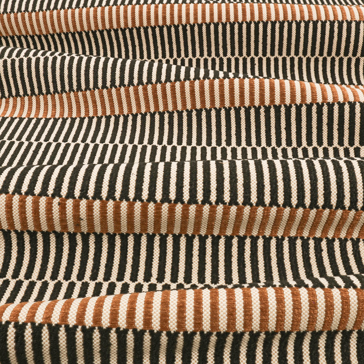 Un tissu jacquard luxueux, Vida Outdoor présente des lignes de rectangles entrelacés, confectionnés à partir de fils bouclés somptueux, qui se combinent pour former un motif à rayures saisissant, créant un rythme visuel intrigant.