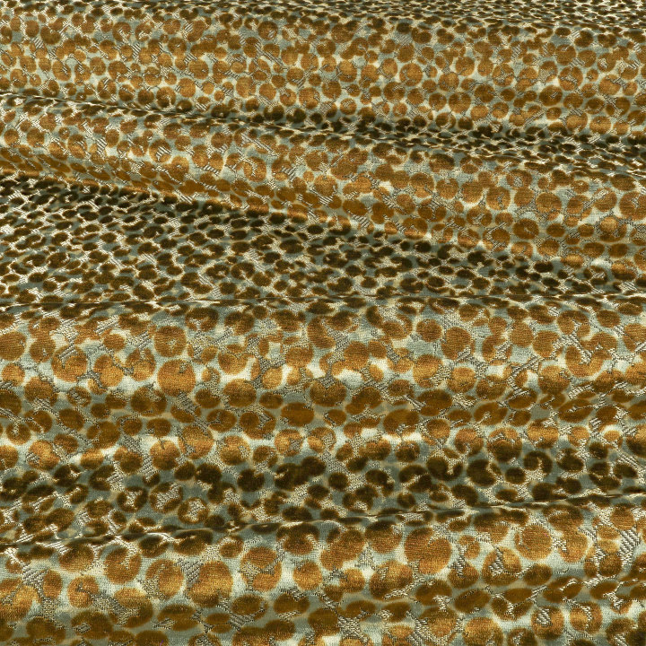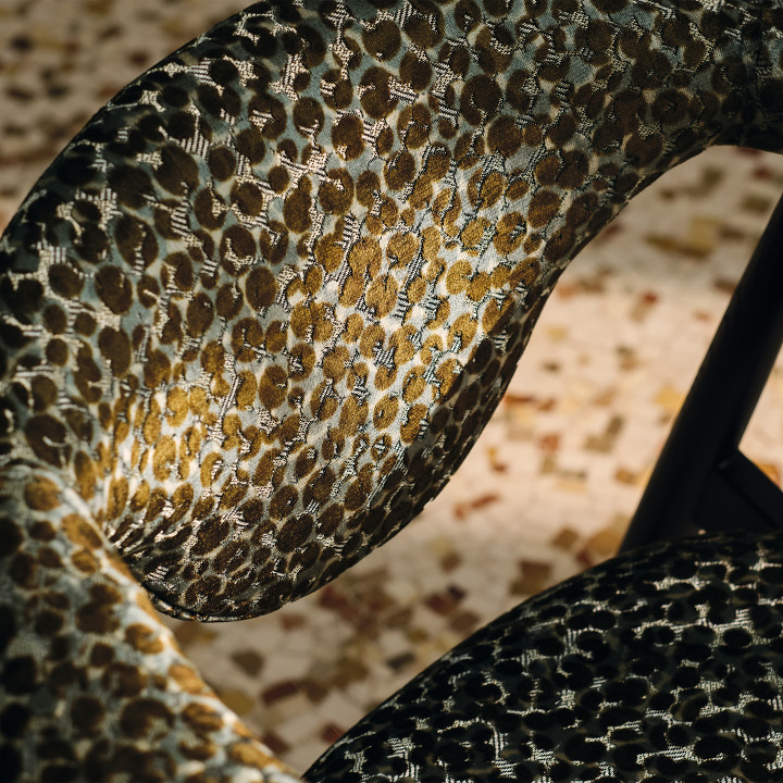 Inspiré par la fourrure luxueuse d'un chat sauvage, Teba est un jacquard décadent tissé de velours où des taches mouchetées émergent de fils métalliques dans un éventail de nuances frappantes pour former un design qui attire l'attention, avec un intérêt textural somptueux.