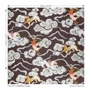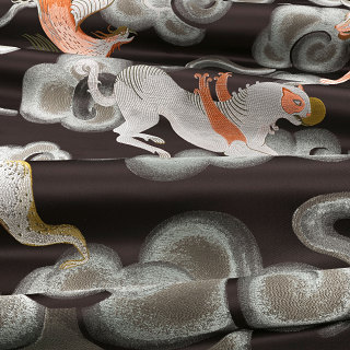 L'un des designs emblématiques de la collection, Chimera, s'inspire de la mythologie antique et dépeint un éventail de créatures ailées fantastiques à la présence imposante, qui s'envolent sur une toile de satin indulgente, avec des nuages éthérés qui ajoutent une douceur onirique. Un tissage jacquard délicatement complexe donne vie à ces créatures en illustrant la nature délicate des dessins originaux réalisés à la main dans des détails impressionnants. Présenté dans une palette de couleurs enchanteresse composée de bronzes antiques, de cuivres ardents et de bruns chocolat riches, ce design décadent affiche une intention expressive audacieuse.