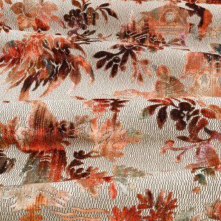 Avec son charmant design chinoiserie et sa touche contemporaine unique, Isenzo nous emmène dans un voyage à travers des scènes traditionnelles de jardins impériaux luxuriants où des oiseaux gracieux prennent leur envol et où des fleurs exotiques s'épanouissent sur un riche velours jacquard. Imprimé d'un motif chevron saisissant cousu au point de flamme dans une palette vibrante d'oranges ardents et de bleus vifs, il crée un tissage audacieux pour les tissus d'ameublement.