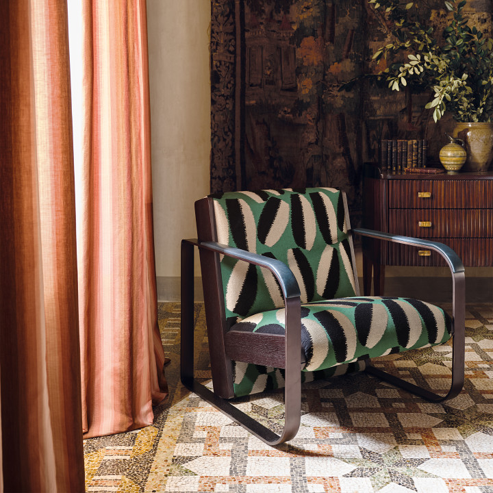 Ondra dégage une élégance intemporelle et un éclat sophistiqué avec sa rayure ombrée attrayante qui présente des détails moirés traditionnels. Inspirée des textiles de soie anciens, une combinaison de structures de tissage complexes forme un jacquard finement tissé qui rayonne d'une élégance intemporelle et d'une brillance sophistiquée.